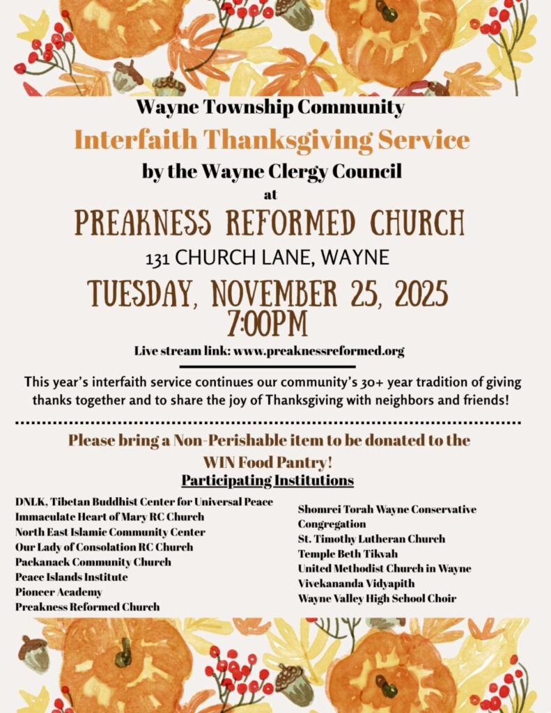 On Tuesday, November 25th, at 7:00pm, Wayne and wider community residents will gather for our Annual Interfaith Thanksgiving Service. Our community has been gathering around Thanksgiving to give thanks together for over 30 years! And the tradition continues.