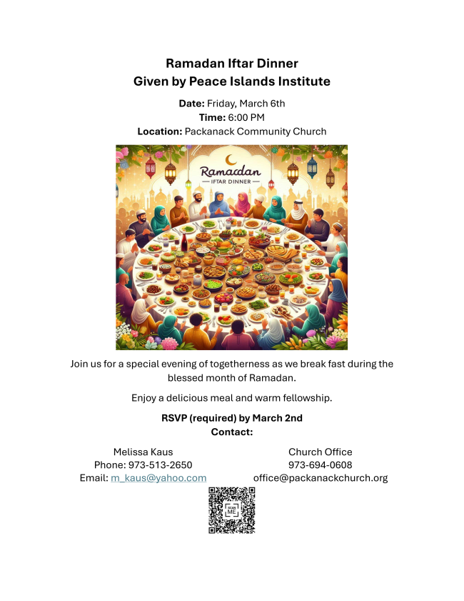Join us for a special evening of togetherness as we break fast during the blessed month of Ramadan. RSVP (required) by March 2nd. Contact the Church office.